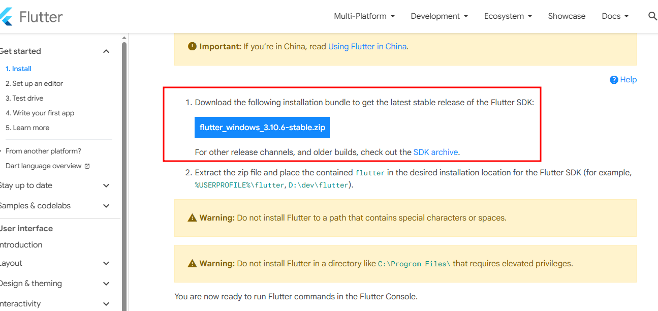 플러터 공식 사이트에 접속하여 운영체제에 맞는 플러터SDK를 설치한다.